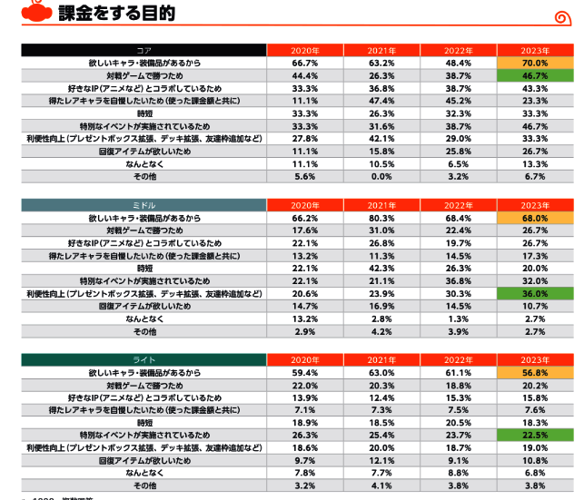 89.5的玩家属于低热层,每月氪金不高于1万日元,中坚层占比7.5%,氪金1~5万,而最核心的5万以上玩家占比3%。