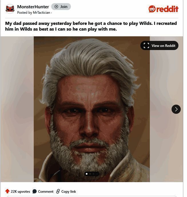 ·MrTactician玩家的父亲在2月28日当天去世,这天刚好是《怪物猎人:荒野》发售日,MrTactician于是决定在自己喜爱的《怪物猎人:荒野》中竭尽全力把去世的父亲捏了出来,感受与父亲在一起的镜像版游戏历程。
