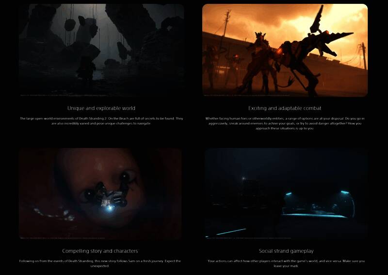 根据商店页,《死亡搁浅2》将以反应性世界和开放式遭遇战设计为特色,从而继续沿用前作的机制。从故事情节上看,粉丝们被告知《死亡搁浅2》将“带来意想不到的事情”。