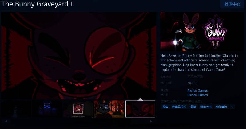 今日(3月1日),像素风恐怖冒险游戏《The Bunny Graveyard II》Steam页面开放,明年发售,游戏暂不支持中文,感兴趣的玩家可以点击此处进入商店页面。