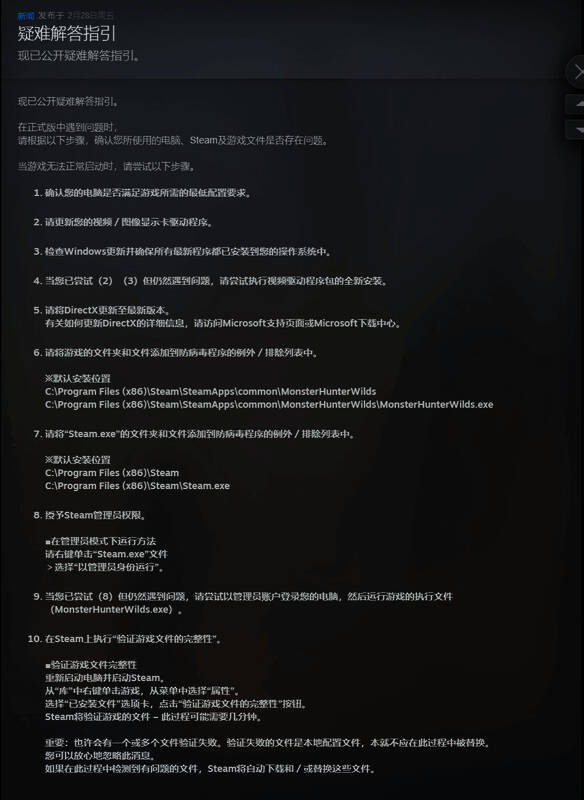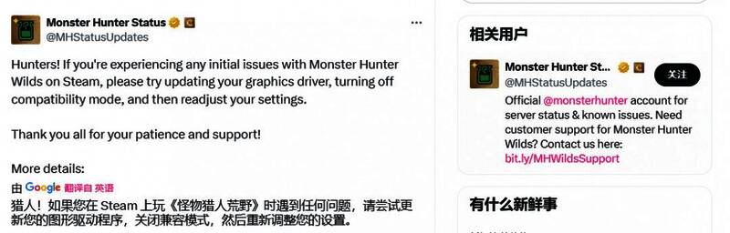 Capcom客服官推回应了《怪物猎人:荒野》PC版优化问题,官方建议PC玩家更新显卡驱动,关闭兼容模式,重新调整设置。