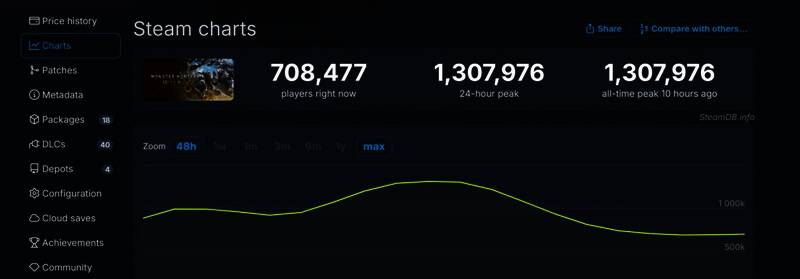 此外,《怪物猎人:荒野》Steam同时在线超过了130万人,当前在线70.8万人。如果PC版没有优化问题,那么本作的同时在线人数可能会高很多。