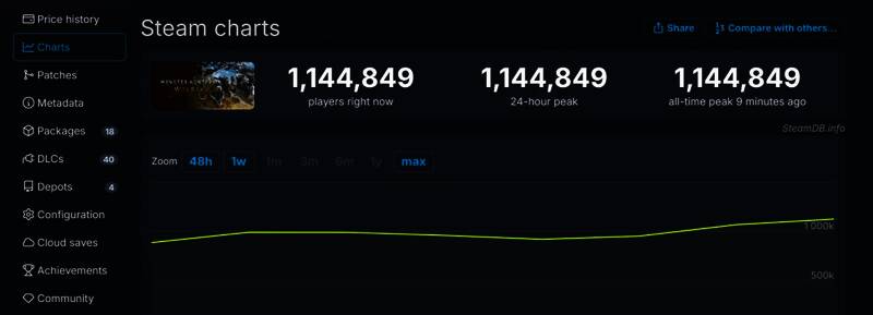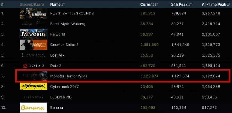 《怪物猎人:荒野》首发Steam同时在线峰值超过了100万,目前为114万4849人,已是Steam上第8个同时在线超过百万的游戏,同时也是Capcom首个Steam峰值破百万的游戏。