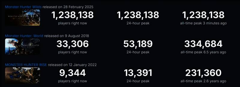 三款《怪物猎人》游戏Steam在线峰值对比