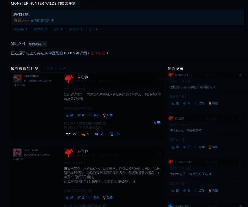 不过口碑方面很差,《怪物猎人:荒野》目前有6757条评价,但好评率只有47%,中文区评价更是差评如潮。只有一个原因:优化!!!