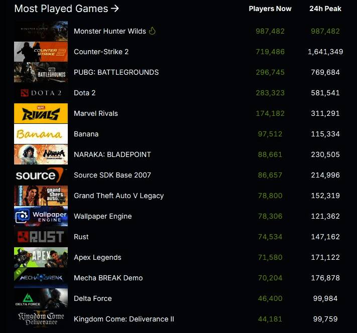 根据SteamDB数据,《怪物猎人:荒野》发售的第一天,steam同时在线98.7万人,现仍在继续增长中,刷新了《怪物猎人》系列的历史记录,现为当前Steam人气榜第一名。
