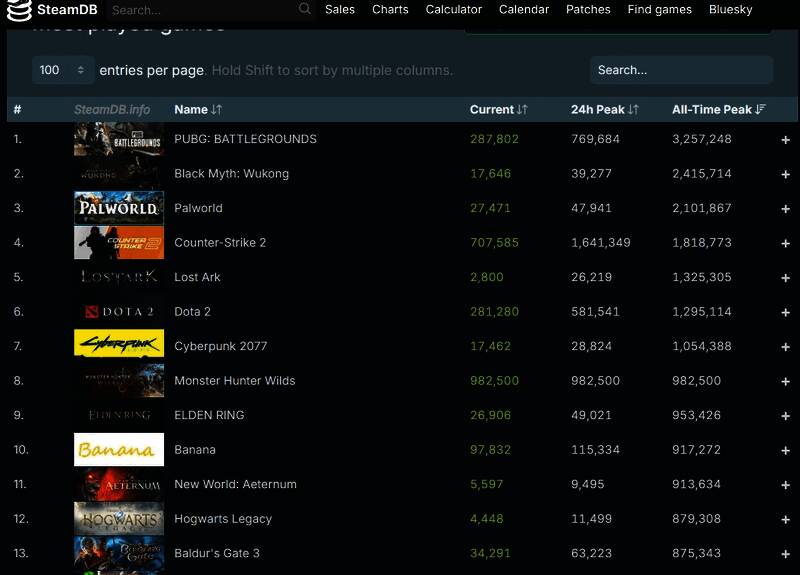 目前游戏在Steam历史人气榜上排第八,已经超过了《艾尔登法环》(95万)和《博德之门3》(87万),距离《赛博朋克2077》也仅差3万人了,相信随着周末的临近,这个差距会渐渐消弭甚至被超越。
