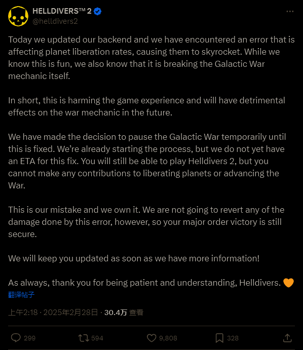 不过覆水难收,官方确认已经完成的进度无法回滚,而管理战争的幕后“Joel”也没有办法扭转局面。开发团队写道:“这是我们的错误,我们将对此负责。我们不会恢复由该 BUG 造成的任何损害,因此目前的重要指令依然是必定成功的。”
