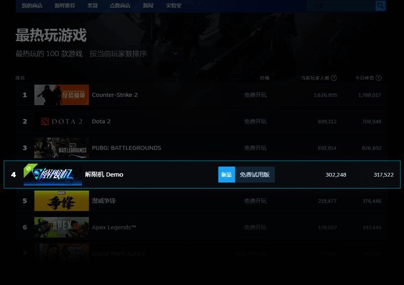 《解限机》于2月23日18时开启本次测试,随即在线人数直线飙升,连续超过《Apex英雄》《永劫无间》《漫威争锋》等在线热门游戏,一举达到317522人,上线仅仅6个小时便成为当日在线人数第4多的游戏。