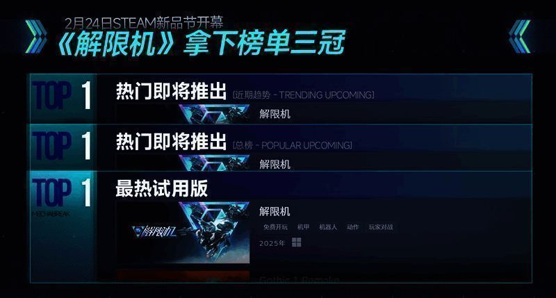 活动上线初始,《解限机》便成功包揽了新品节的三项榜单第一:热门即将推出(趋势榜/总榜),以及最热试用版榜。