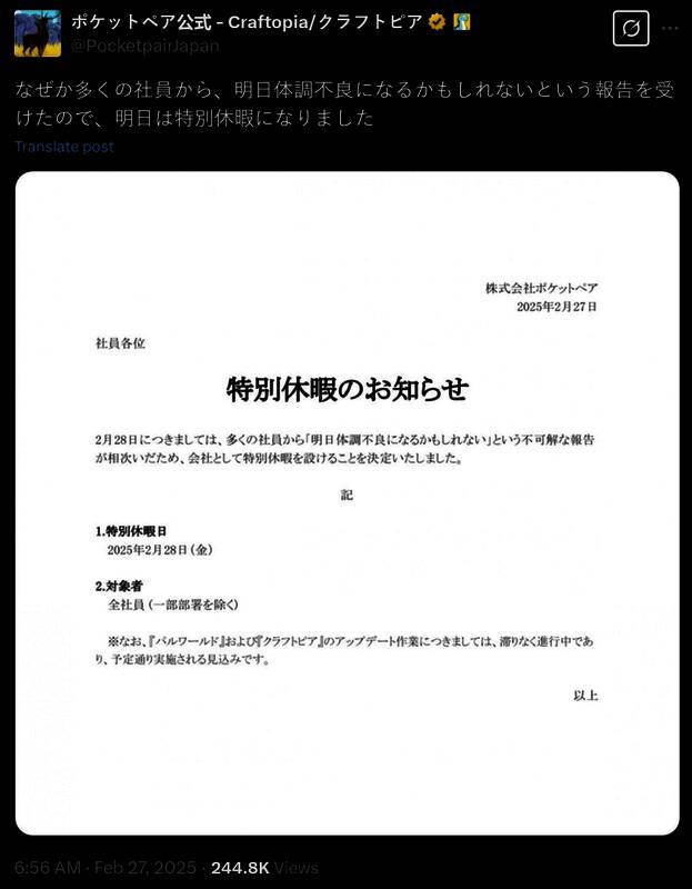 虽然官方没有说放假是为了让员工玩《怪物猎人:荒野》,但开玩笑称:“不知为何,收到了许多员工明天可能身体不适的报告,所以决定特别休假一天”。