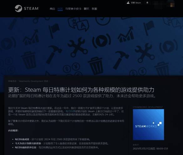 V社在上面写道:“仅在2024年,每日特惠活动就帮助数千款游戏在Steam首页和相关标签页面获得了专门的曝光,帮助这些游戏在过程中各自赚取了数万到数十万美元。”