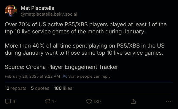 市场分析公司 Circana 分析师 Mat Piscatella 日前在社交媒体上分享称,显示 2025 年1 月美国超过 40% 的 PS5 和 Xbox Series X玩家游戏时间均花在了排名前 10 名的实时服务游戏游戏上。