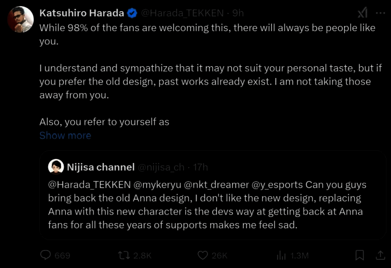《铁拳》系列制作人原田胜弘对这位粉丝反驳道:“虽然有98%的粉丝欢迎这个改动,但我理解并同情这可能不符合你的个人口味。如果你更喜欢旧的设计,过去的版本也还在,我并没有将它们从你那里拿走。另外,你称自己为‘安娜粉丝’,仿佛代表所有安娜的粉丝,但你应该以个人的身份表达意见。”