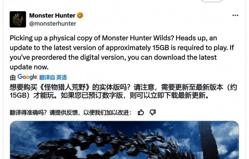 昨天,《怪物猎人》官推发布消息,友情提示那些预购了《怪物猎人:荒野》实体版的玩家,他们需要将游戏版本更新至最新版,需要更新15GB首日补丁。不过如果你预购的是数字版,那么现在就可以预载最新版本的《怪物猎人:荒野》。