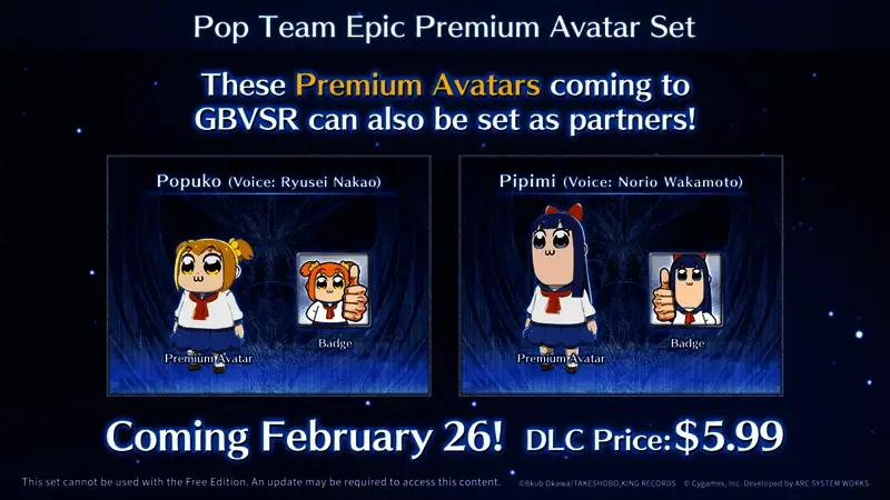 “PopTeam Epic”联动开始!动画和漫画作品《PopTeam Epic(pop子和pipi美的日常)》中的“pop子”和“pipi美”化身虚拟形象在《GBVSR》中登场。购买本商品不仅可获得大厅虚拟形象和用于个人资料的徽记,“pop子”和“pipi美”还会作为搭档为玩家加油助威。