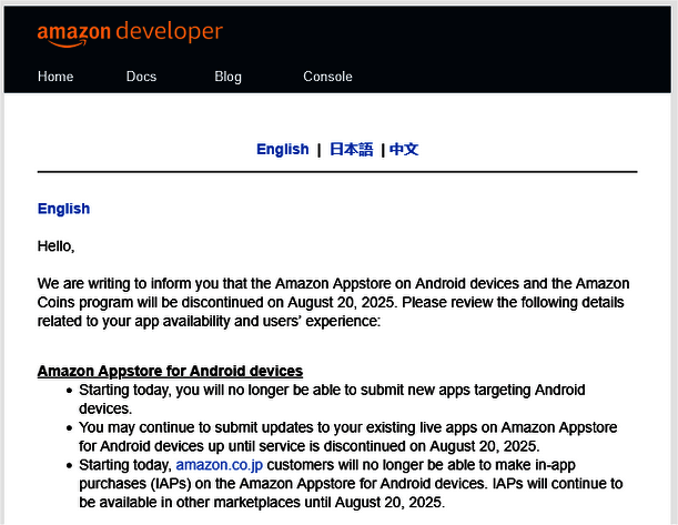 开发者通知中亚马逊表示,从 2 月 20 日起将不再接受新应用提交,并且在 8 月 20 日后将不再接受面向第三方安卓设备的应用更新。而在日本的客户“将无法再在适用于安卓设备的亚马逊应用商店上进行应用内购买”,但其他国家将一直支持,直到 8 月 20 日。