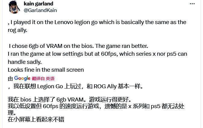 评论区有玩家留言称,《怪物猎人:荒野》可以在联想掌机legion go上游玩,但体验和ROG Ally差不多。不过这名玩家注意到,《怪物猎人:荒野》特挑显存,4GB显存没法玩,8GB显存效果很差,只有6GB显存效果才好。