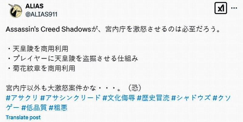 近日日本玩家ALIAS(@ALIAS911)发推文称,育碧在《刺客信条:影》中多处设计有违历史,甚至是“文化侮辱”“历史亵渎”。