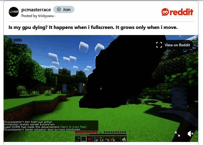 ·玩家的展示中,一坨不明状态的黑色阴影团块正在向景色袭来,看上去异常的诡异可怕。之后发帖询问,是不是自己的显卡出现问题。