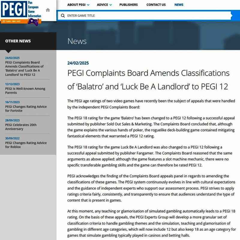 在2024年2月20日发售的卡牌Rogue游戏《小丑牌》,因被指责“包含突出的赌博图像和指导赌博的材料”内容,而在部分国家和地区下架,其PEGI(泛欧洲游戏信息组织)评分也为18+,意味着只有成年人才可以购买游玩本作。