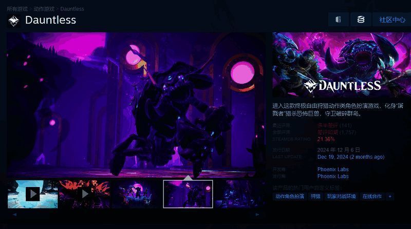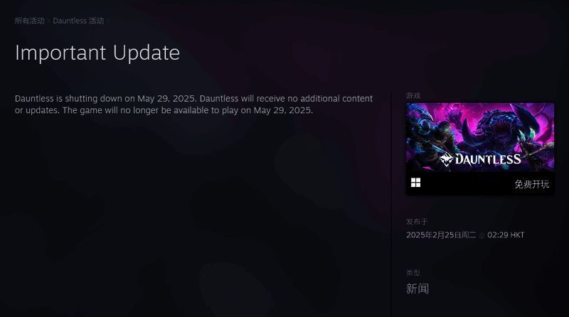 开发商 Phoenix Labs 日前在 Steam 和社交媒体上宣布,免费类怪猎合作动作游戏《无畏(Dauntless)》将于 2025 年 5 月末关服。