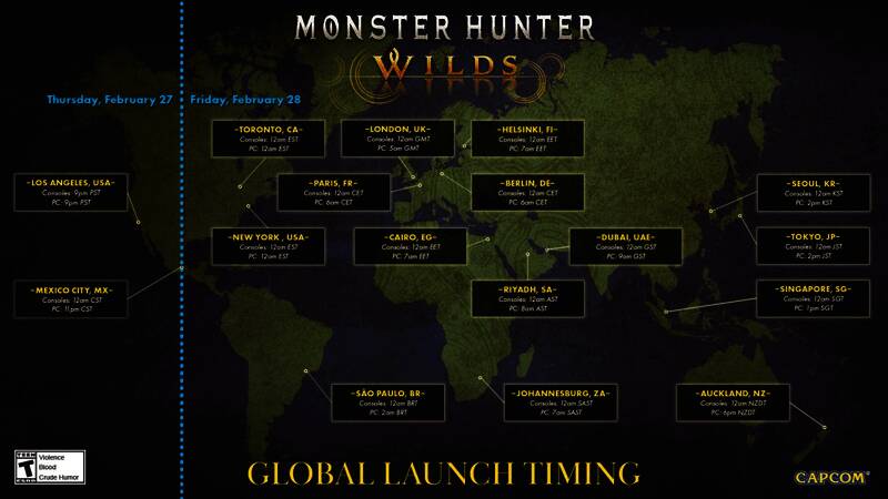 《怪物猎人:荒野》即将在这个月底发售,日前有国外玩家制作了一张《怪物猎人:荒野》全球发售时间表,备有主机版和PC版不同的解禁时间。