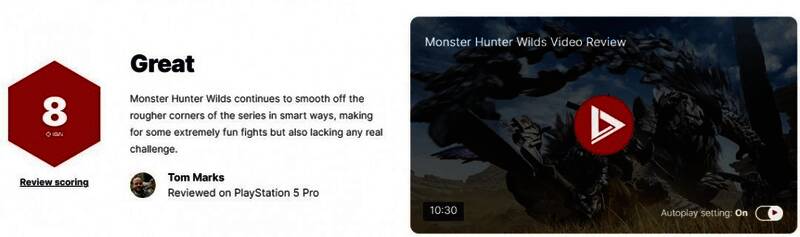 《怪物猎人:荒野》媒体口碑已解禁,外媒IGN为其打出8分好评。IGN认为该作战斗有趣,玩家能轻松成为顶级猎人,但游戏缺乏真正的挑战。