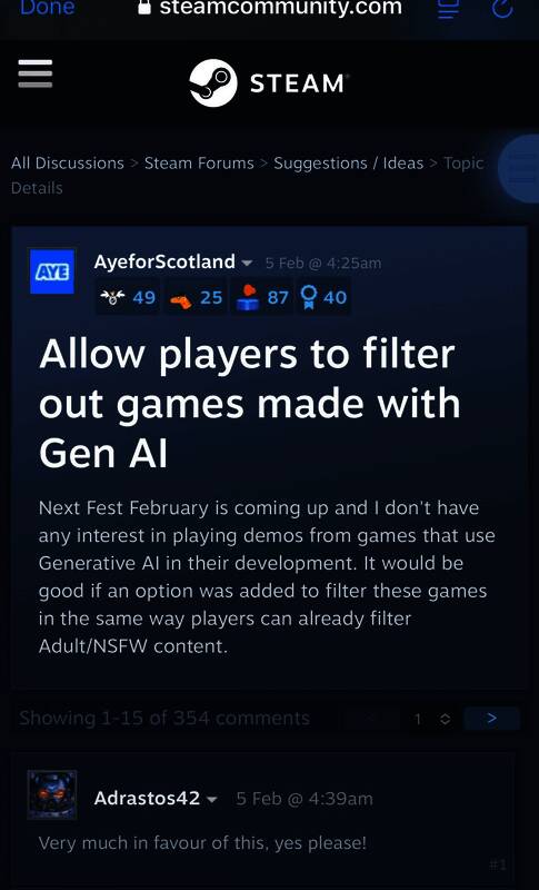 这名玩家写道:“下个新品节就要来了,我对使用生成式AI开发的任何游戏都没有兴趣。如果Steam能像添加过滤器筛掉那些成人/NSFW内容的游戏那样,对采用了AI技术的游戏也能有同样的过滤选项,那么这将是一个非常好的选择。”