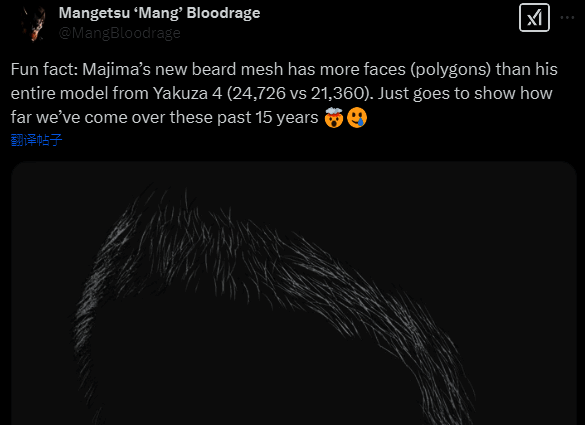 世嘉旗下经典游戏《如龙8外传》已经于2月21日发售,登陆PC(Steam/Microsoft Store)/PS5/PS4/Xbox Series X|S/Xbox One,日前有玩家分享了游戏细节,主角真岛的胡子多边形数量已超《如龙4》时的角色全身。