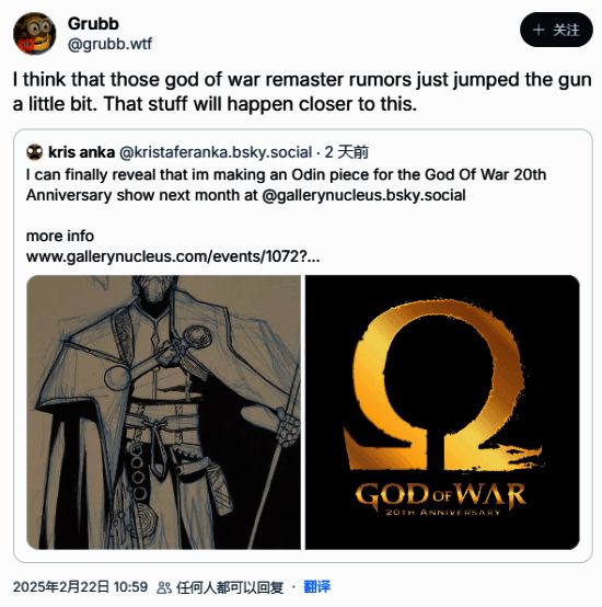 但在2月22日又有了新的传言,据游戏网站Giant Bomb的Jeff Grubb透露,希腊《战神》复刻版可能在三月接近该系列的20周年时公布。他引用了艺术家Kris Anka的推文,他说他们受委托为《战神》20周年纪念展创作一位奥丁的形象,该纪念展定于三月举行。