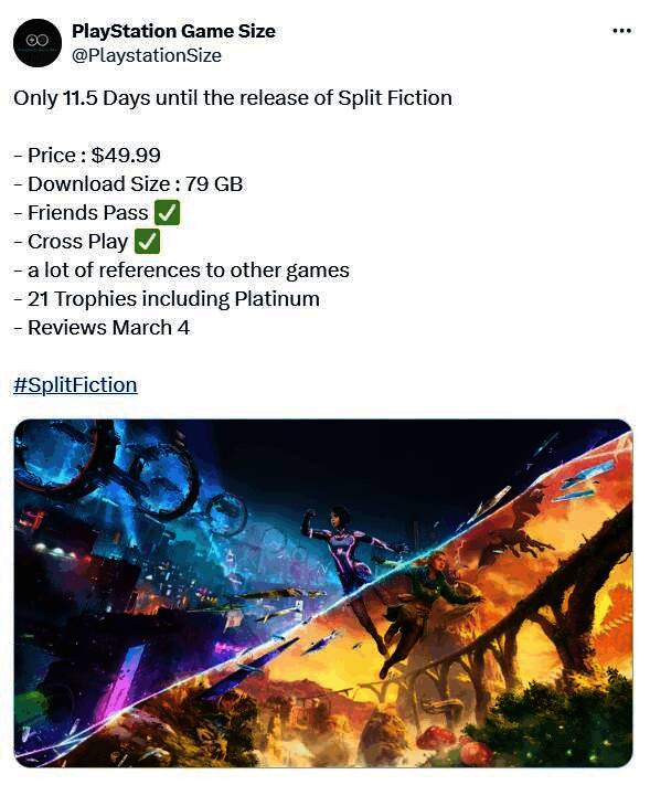 根据知名爆料推主PlayStation Game Size的消息,《双人成行》开发商Hazelight Studios新作《双影奇境》PS5版下载大小约为79 GB,共包含21个奖杯(含白金杯),媒体评分预计将于3月4日解禁。