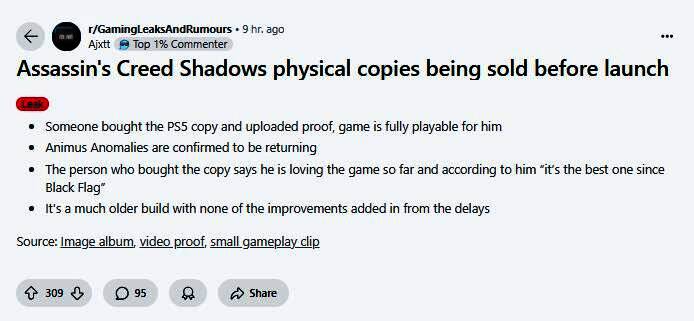 不过目前除了在相关论坛等第三方社交媒体和社区中有着《刺客信条:影》偷跑的消息外,并未有具体的视频截图等内容出现(有PS5实体版游戏出售相关链接,显示为已售出)。