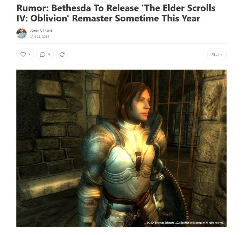 有意思的是,此前传闻称B社官方正在委托外包公司维塔士复刻《上古卷轴4:湮灭》(也有报道说是重制),如果是真的,那么就会出现“官方vs民间”的尴尬对决情况。