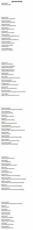 该奖杯列表与《怪物猎人:世界》的列表非常相似,仍然包含“大小金”奖杯,这也是游戏获得白金杯过程中最耗时和最费力的部分,值得一提的是,《怪物猎人:世界》的“白金率”为4.62%。以下是全奖杯列表(包含剧透):