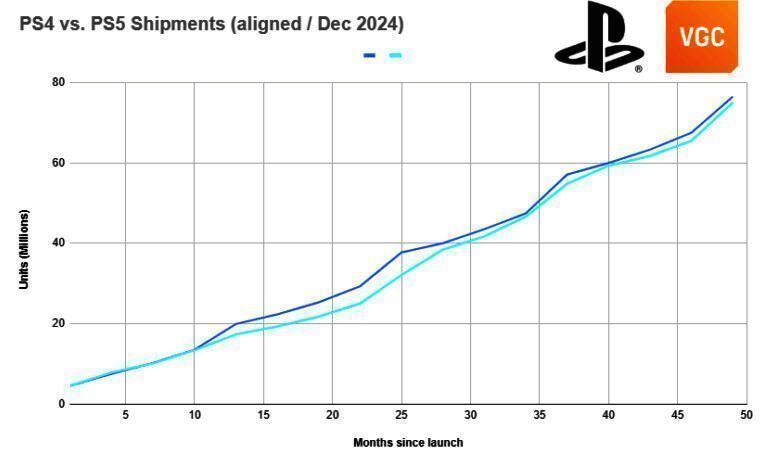 索尼尚未公布PS5 Pro的官方销售数据。然而,其最新财报首次纳入了PS5 Pro的销售情况,并显示在上市同期对齐的情况下,PS5的总销量现已仅落后PS4同期150万台(7500万台对比7650万台)。