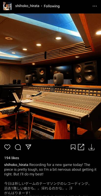 而根据平田志穂子发布的照片,她录制歌曲的地方在日本东京MIT Studio(2号工作室)——这与《女神异闻录5魅影攻手》“录音制作花絮”的拍摄地相同,也是过去十年中大多数《女神异闻录》配乐的录制地……