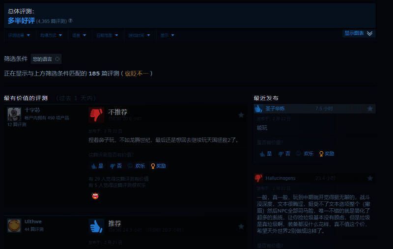黑曜石RPG新作《宣誓》现已正式发售了三天,该作在Steam上的评价已从首发的“特别好评”降到了“多半好评”,好评率从81%降至目前的79%。
