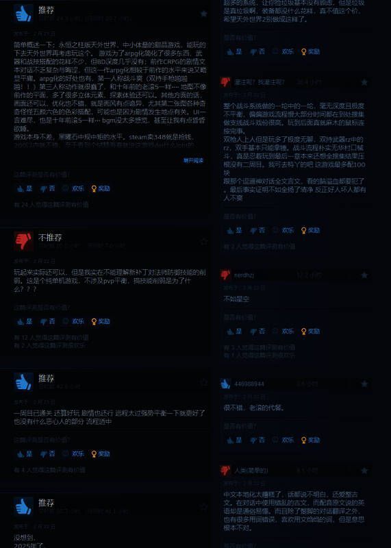 玩了23小时的玩家指出,《宣誓》整体质量比较一般,NPC全部脸部僵硬,毫无特色,战斗没有深度,沉浸感太弱,有点担心《天外世界2》