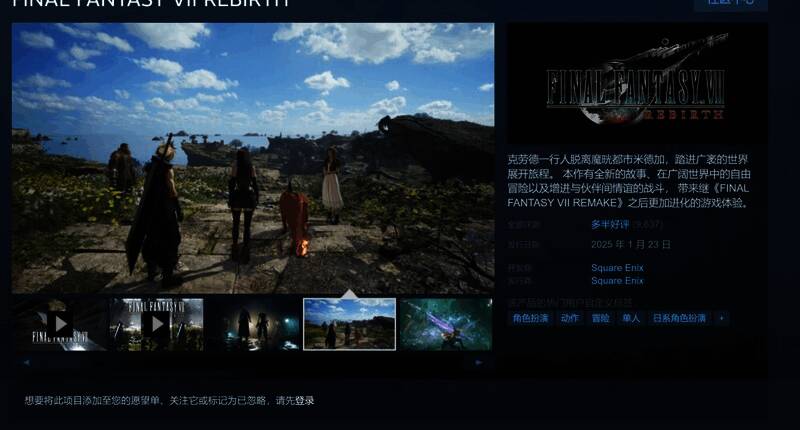 Steam销量大幅提升,《最终幻想7:重生》排名升至第三位