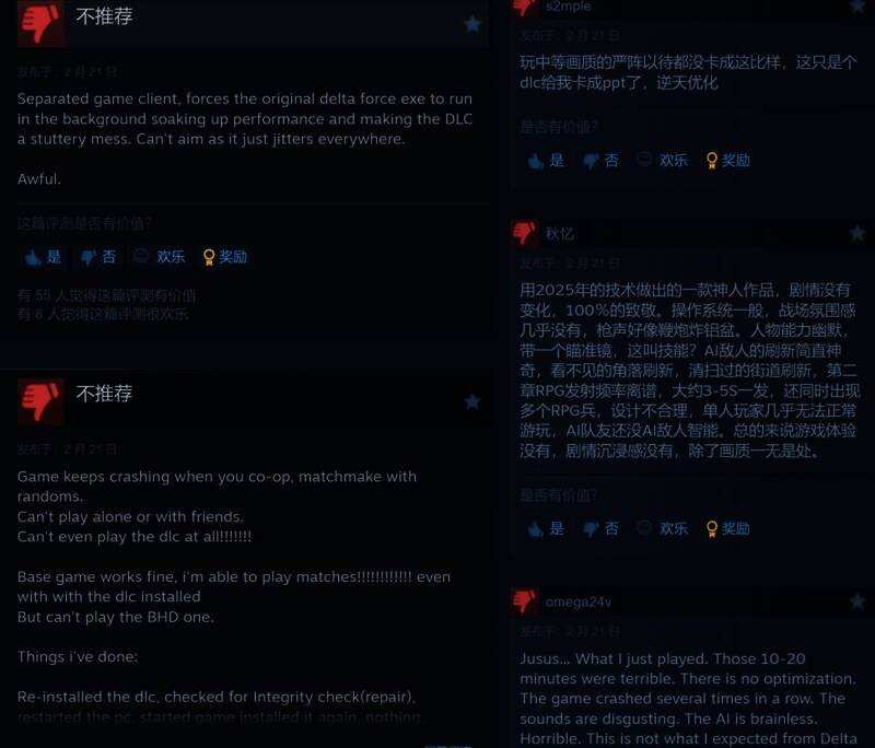 不过,游戏目前还存在一些问题,比如有国外网友反应《黑鹰坠落》和本体游戏不一个客户端,强制在后台运行《三角洲行动》游戏exe文件,消耗性能,导致《黑鹰坠落》卡顿,甚至连瞄准都很难。