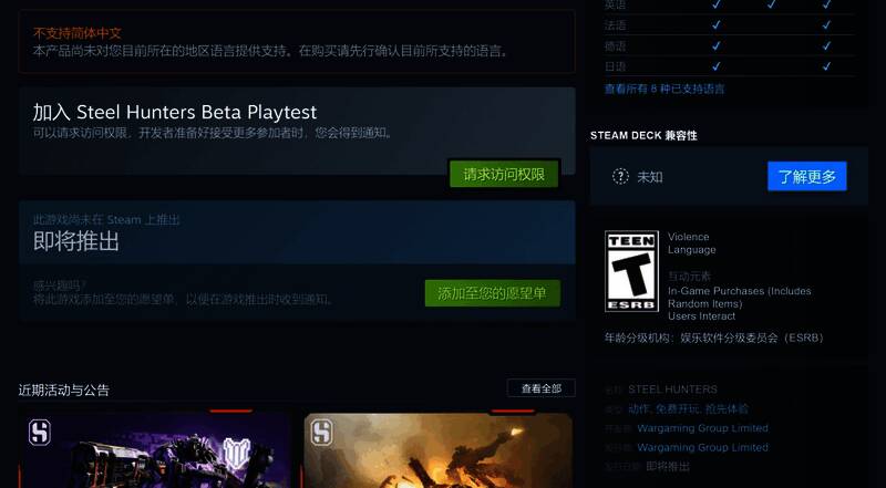 Beta测试可以通过Steam商店页面申请访问来参与。