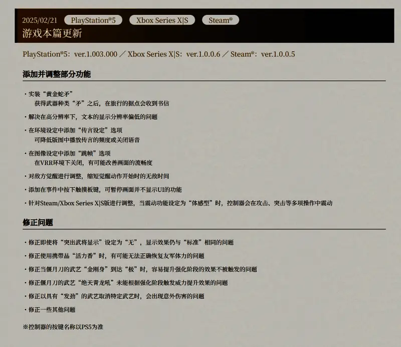 2月21日,光荣特库摩发布了《真三国无双:起源》新版本更新,版本号1.003.000(PS5)、1.0.0.5(Xbox Series X|S和Steam),除了修复游戏问题外,还为游戏实装了新武器“黄金蛇矛”,并调整了部分功能。