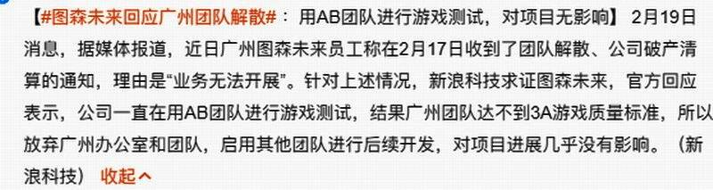 对此,新浪科技向图森未来求证。图森未来官方回应称:“公司一直在用AB团队进行游戏测试,结果广州团队未能达到3A游戏的质量标准,所以决定关闭广州办公室并解散团队,启用其他团队进行后续开发。”