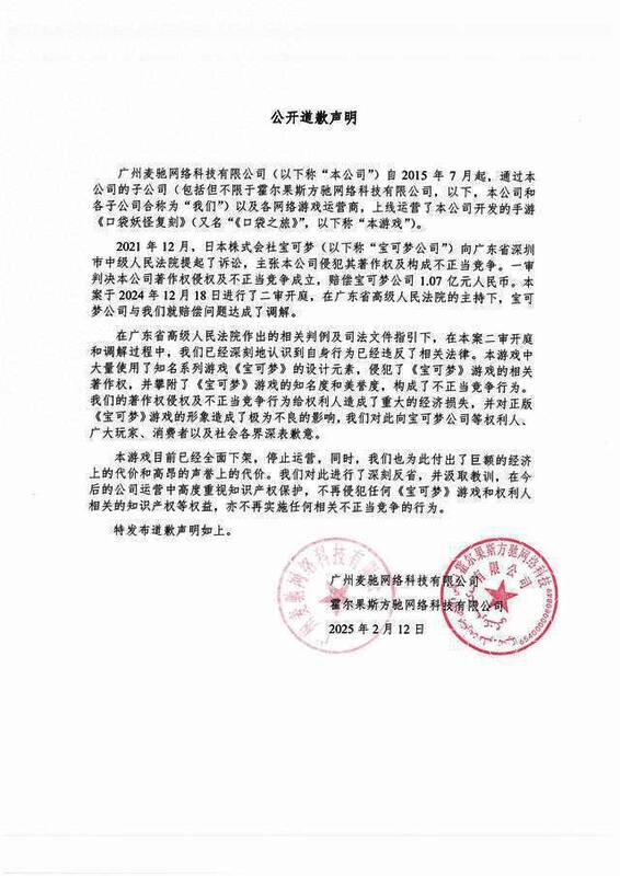 而根据广州麦驰网络科技有限公司发布的最新公告显示,本案二审于2024年12月开庭,在广东省高级人民法院的主持下,广州麦驰网络科技有限公司已与宝可梦公司就赔偿问题达成调解,并全面下架停运游戏,承诺今后不再侵犯《宝可梦》游戏和权利人相关的知识产权等权益,亦不再实施任何相关不正当竞争的行为。