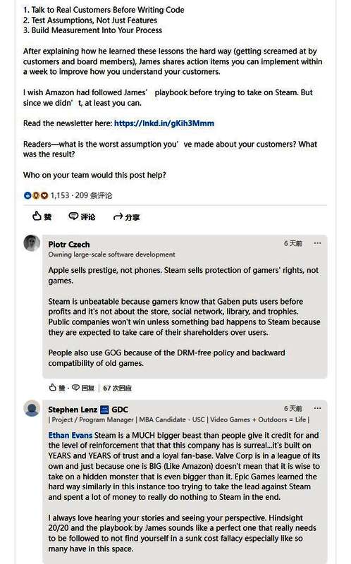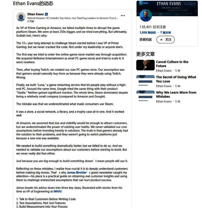 近日亚马逊前副总裁Ethan Evans在其个人领英上发布了一篇帖子,其中提到了亚马逊之前的尝试,他说:“我们多次试图颠覆Steam游戏平台,但都失败了。我们的规模至少是Steam的250倍,我们尝试了所有方法。但最终还是失败了。”