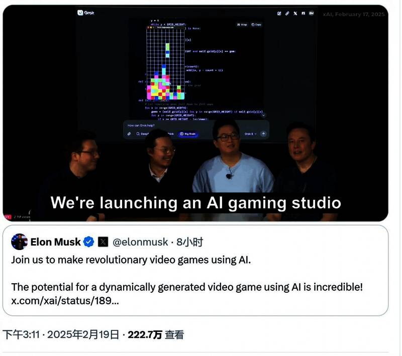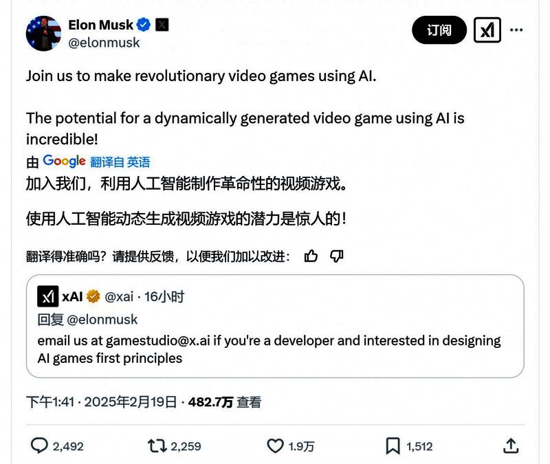 今日xAI在X上发推:“如果你是一名开发者,并且对设计AI游戏的第一原则感兴趣,请发送电子邮件至gamestudio@x.ai。”