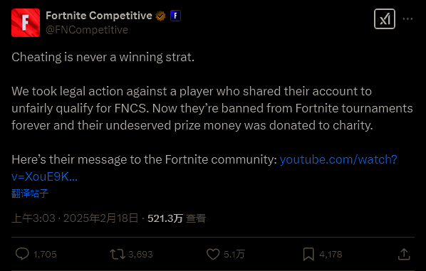 《堡垒之夜》电竞官方推特(X)账户写道:“作弊永远不是制胜策略。我们对一名分享账户以不公平地获得FNCS 资格的玩家采取了法律行动。现在,他们被永久禁止参加《堡垒之夜》比赛,他们不应得的奖金被捐赠给了慈善机构。”