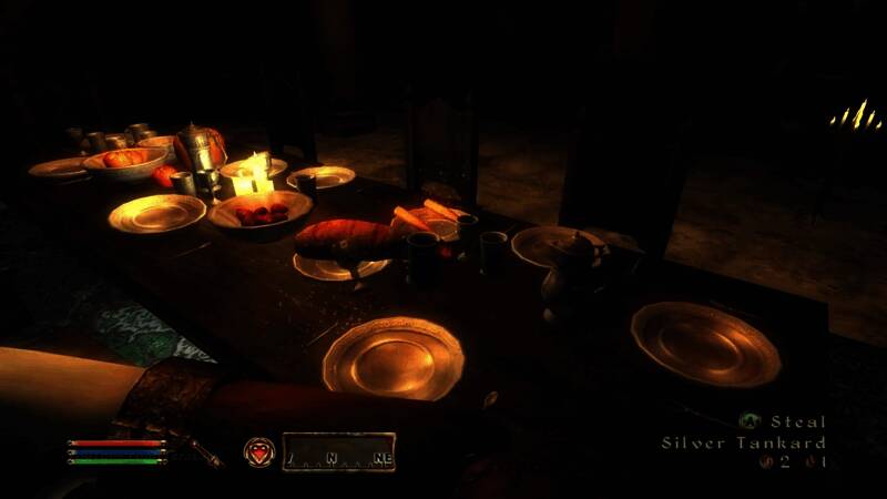再者,饭桌上摆放的食物和餐具,在《上古4》中使用剑乱砍,出现和现实几乎一样的物理动画,物体因为激烈碰撞,有的发出刺耳的声音,伴随着细微的火花,有的甚至被打翻在地。但在《宣誓》中,这些物体直接是不可破坏,是静止的。