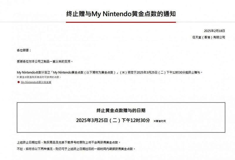 2月18日,任天堂宣布将停止发放实体版和数字版游戏的My Nintendo黄金点数,具体实施时间为2025年3月25日12:30,在上述日期之后,玩家购买Switch游戏原则上将不再会获得My Nintendo黄金点数,以下两种情况除外: